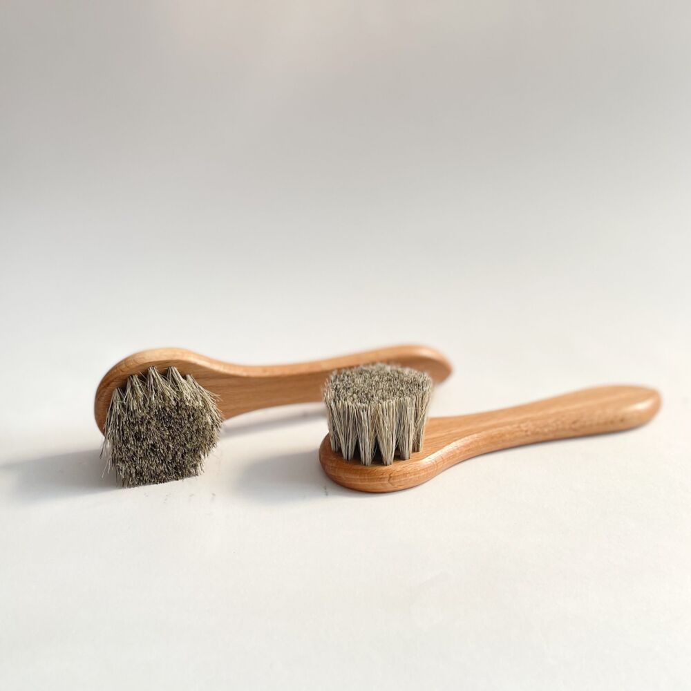 This Small Horsehair Brush is the same one we use in-house, at BoundAries Leather. It’s the perfect size for applying polish (fits just right in your regular shoe cream jar or polish tin). We also use them to apply Saddle Soap and Huberd’s Shoe Grease.